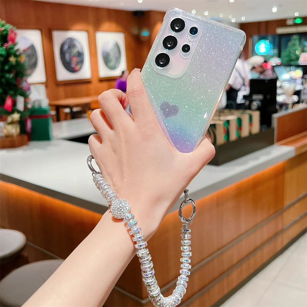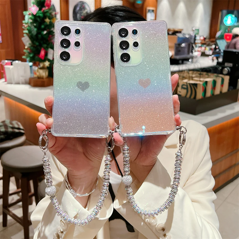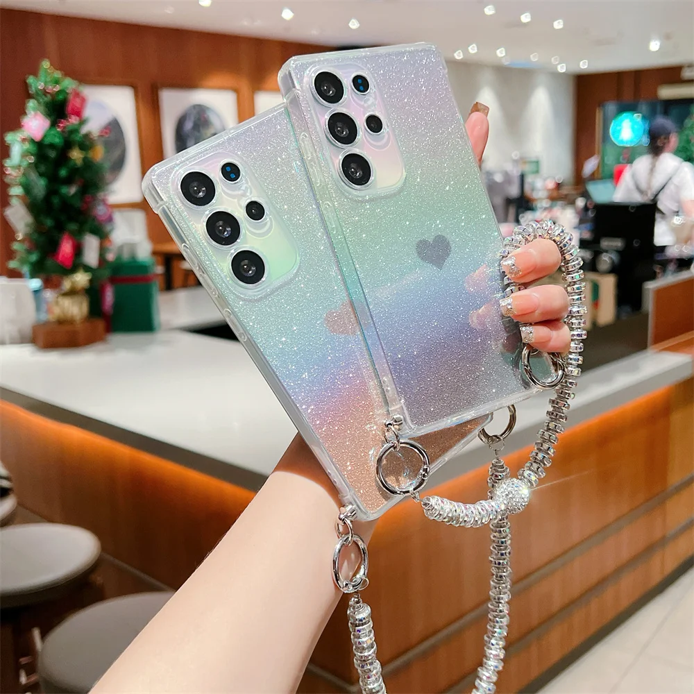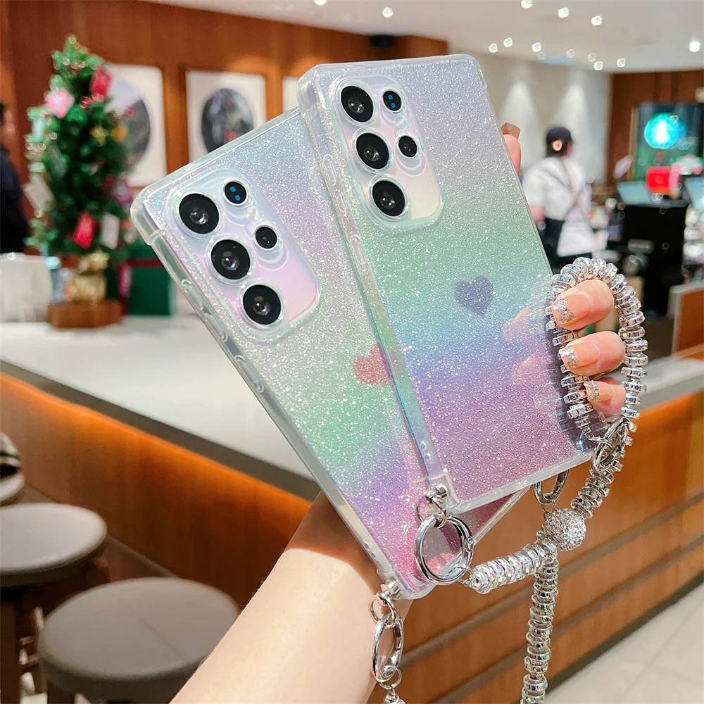 Gradient Glitter Love Heart Wrist Chain Case for Samsung