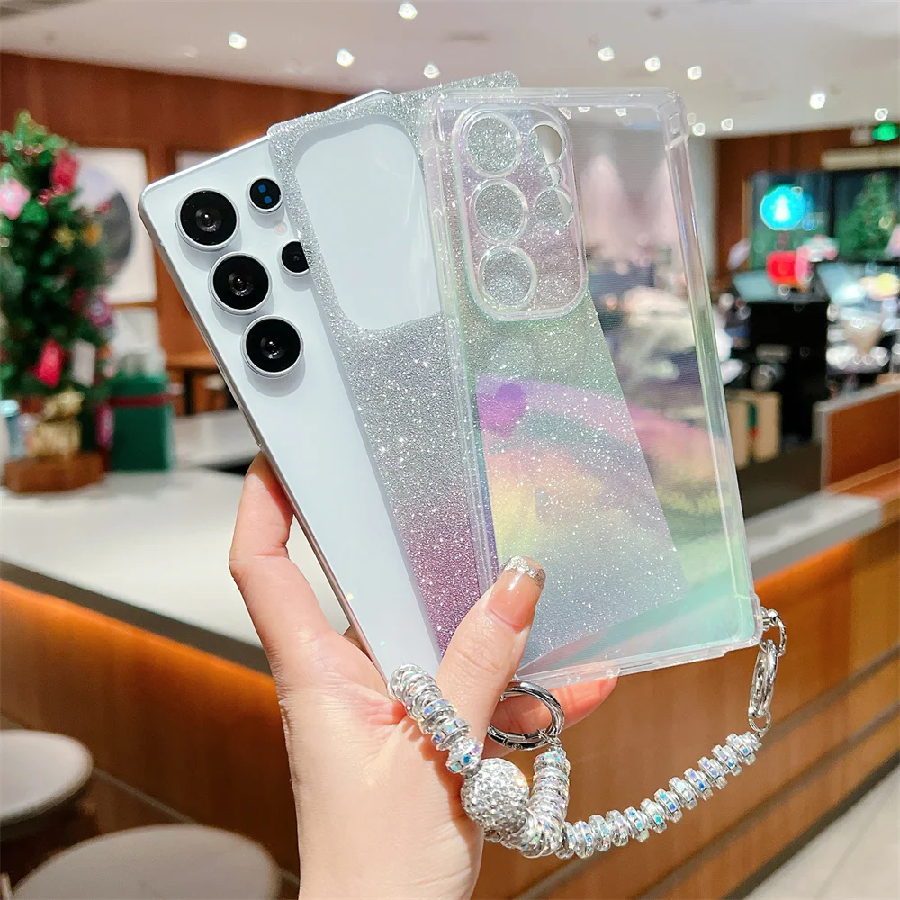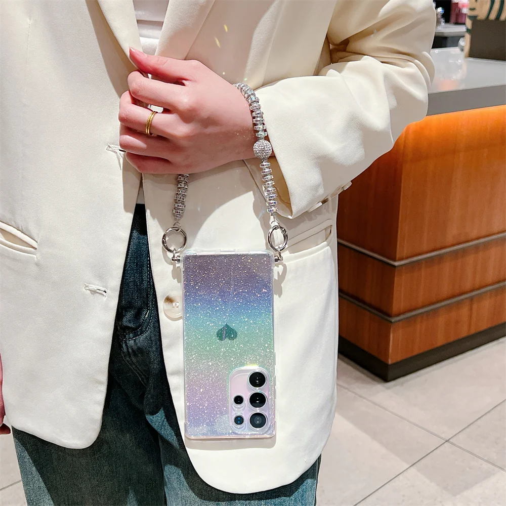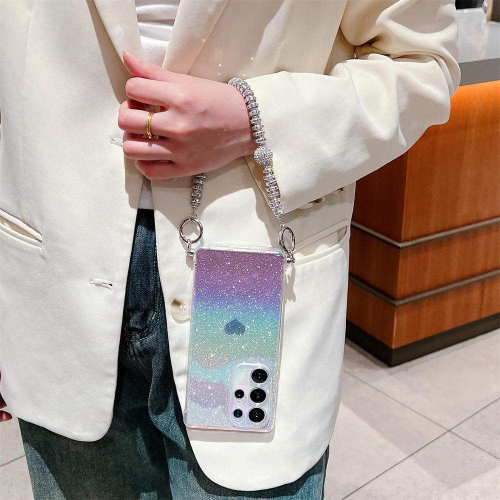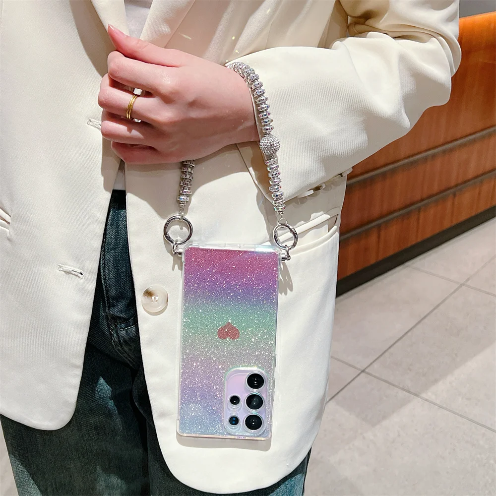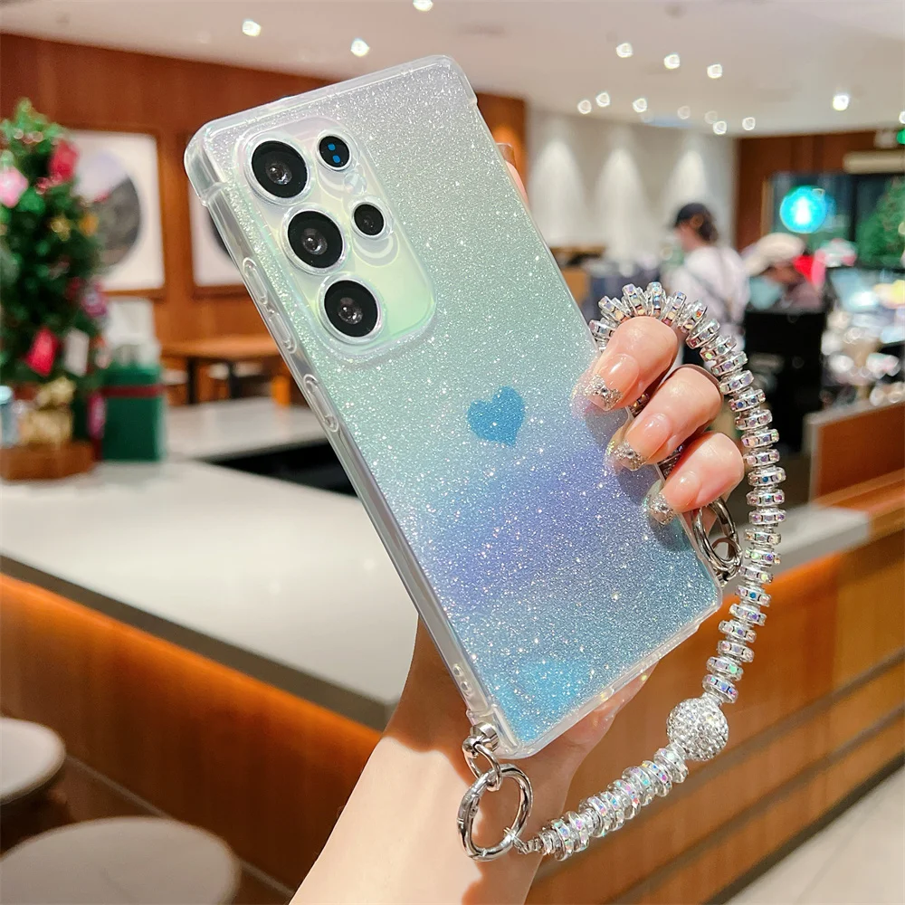 Gradient Glitter Love Heart Wrist Chain Case for Samsung