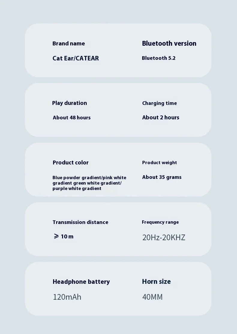 Bluetooth version: 5.2Supported models: All Bluetooth devicesSpeaker unit: 40mmMaximum battery life: 48 hoursCharging time: about 2 hoursBattery capacity: 400mAh